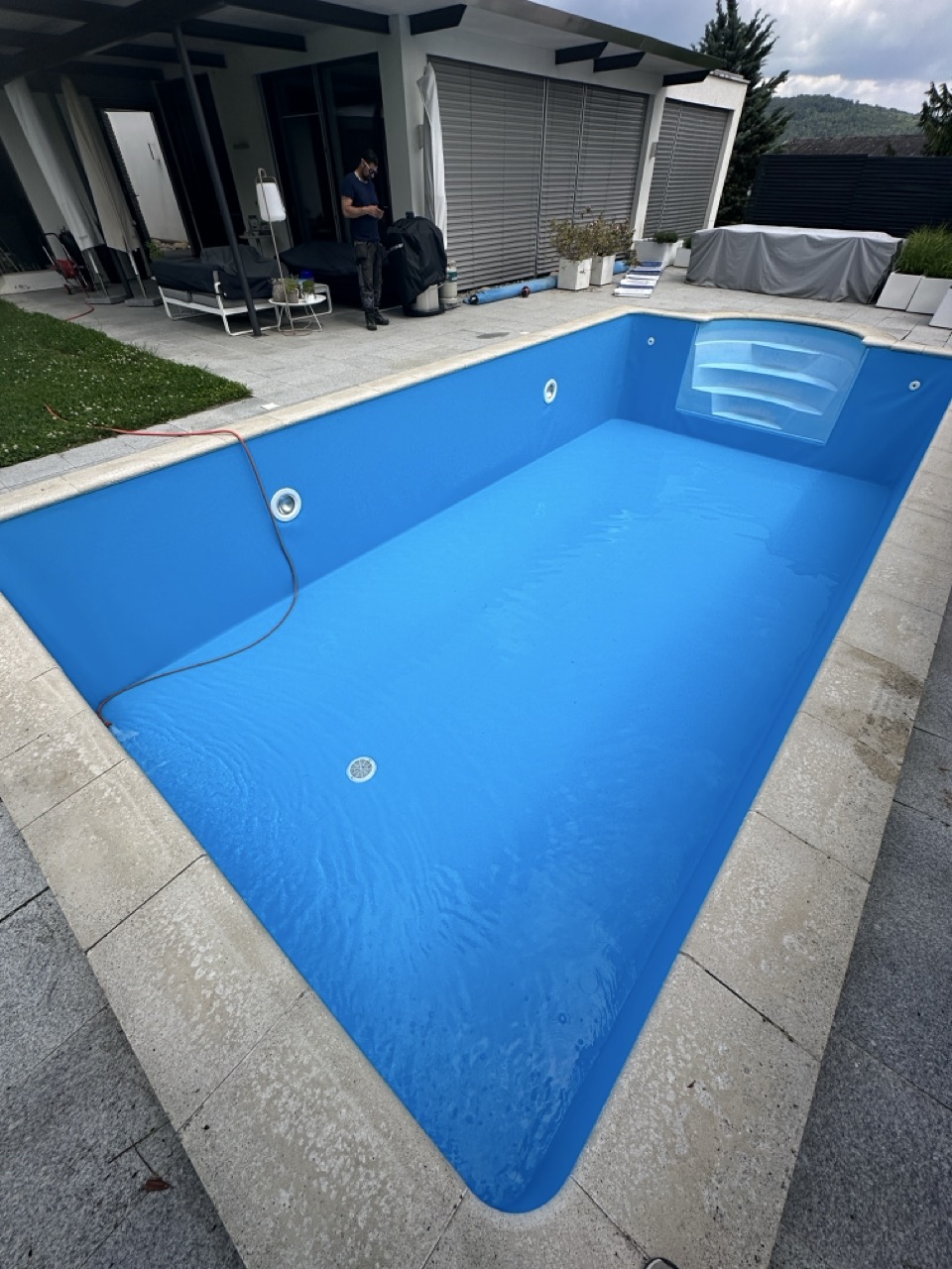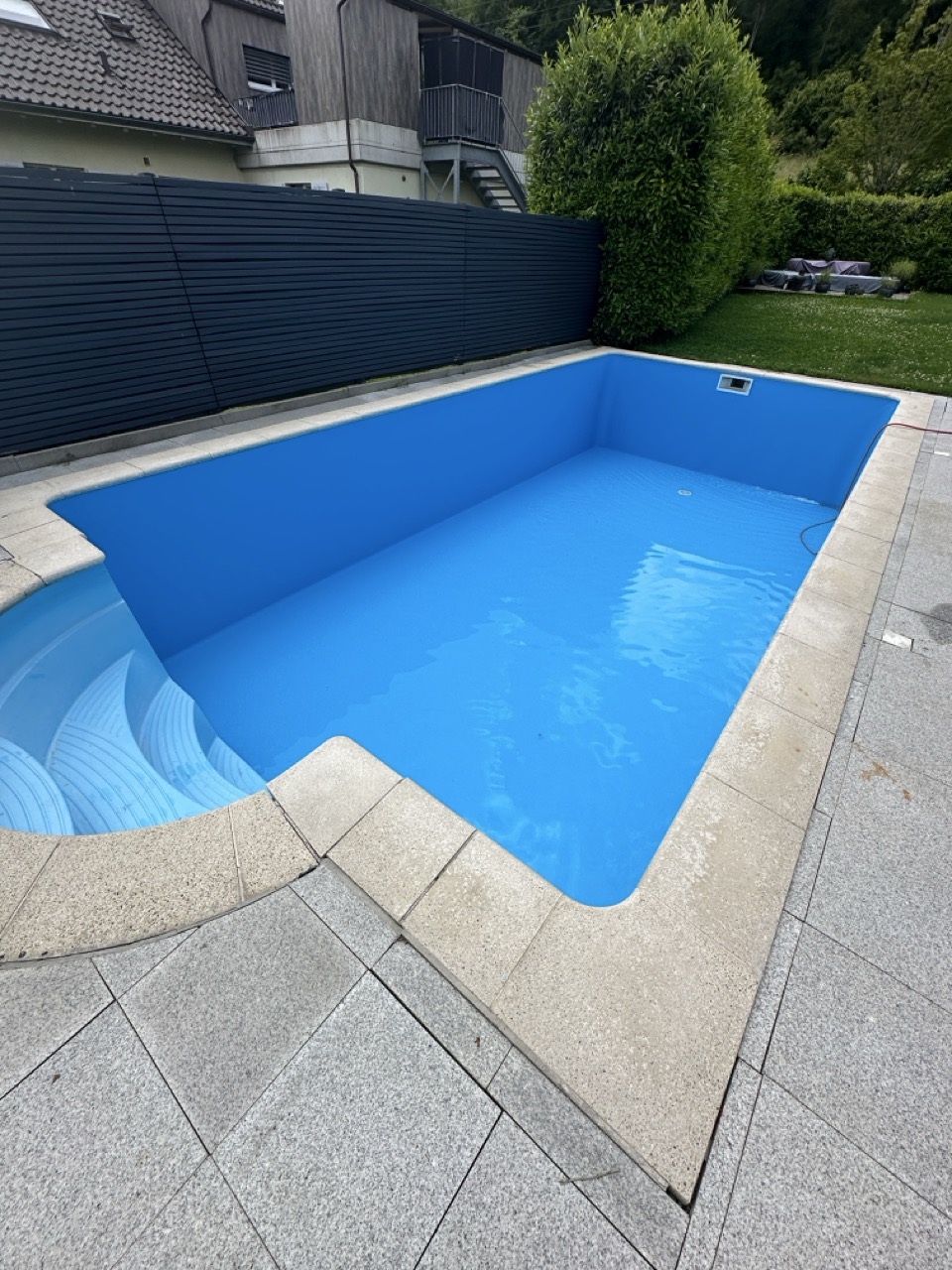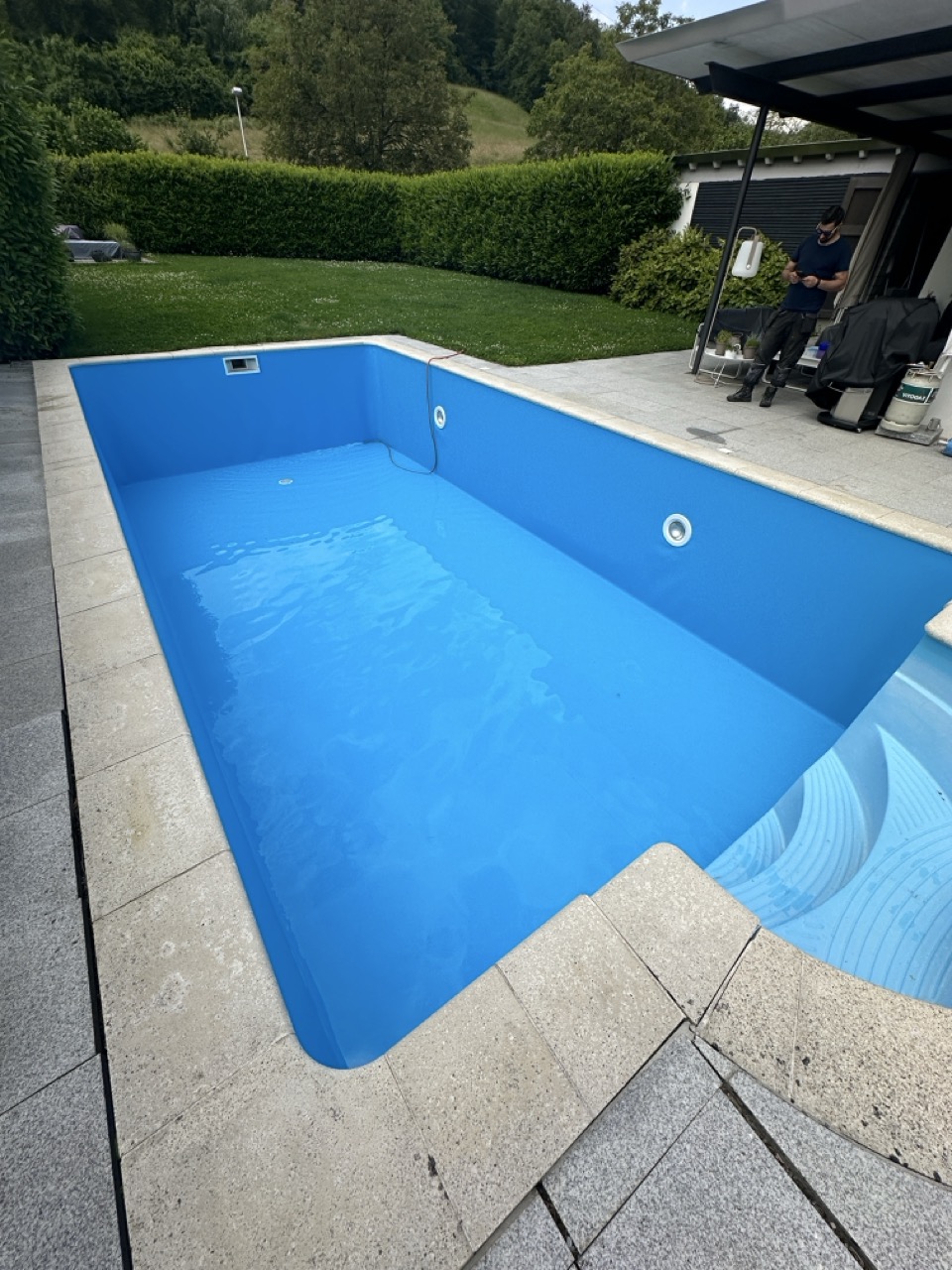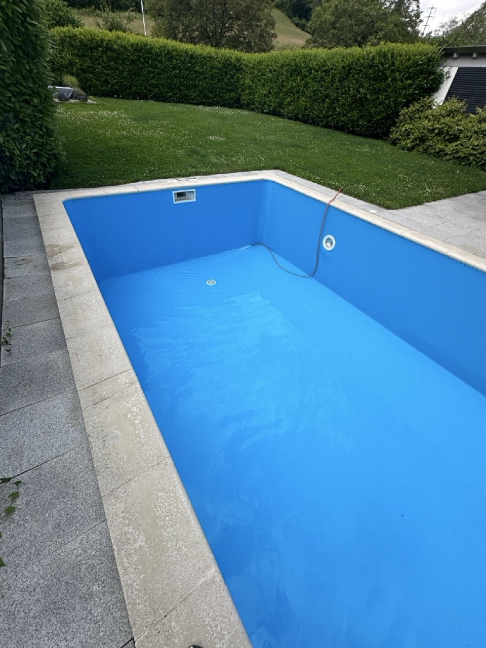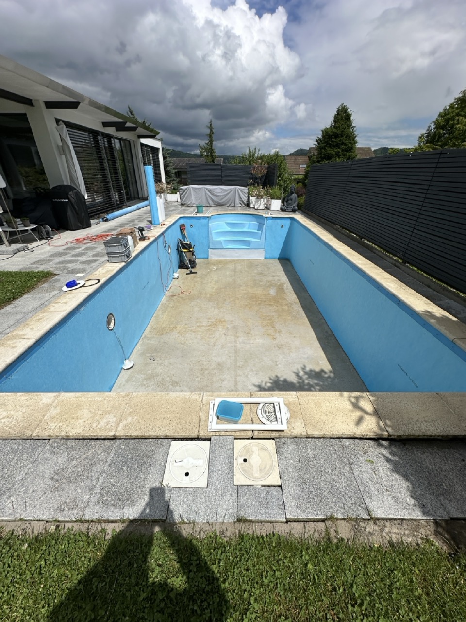 Wir durften für unseren Kunden sein Becken komplett sanieren, das heisst alte Folie und Vlies raus, Wände abschleifen und mit neuem Unterlagsvlies und Folie auskleiden.