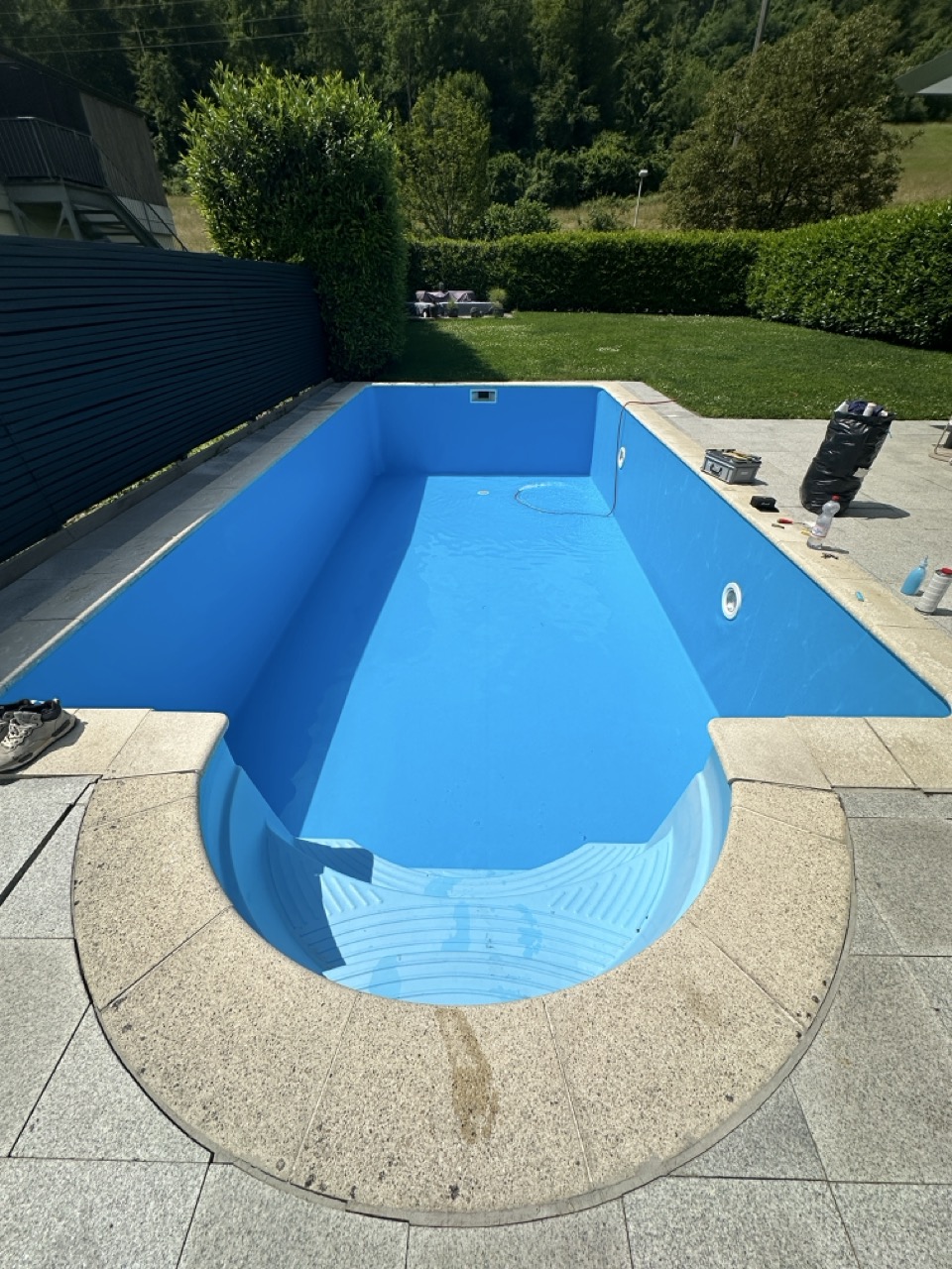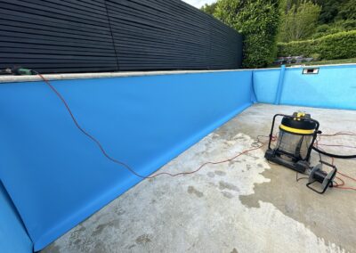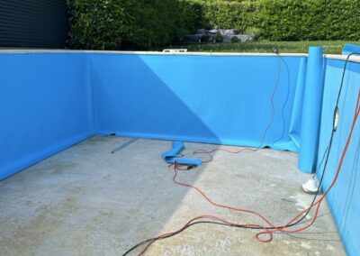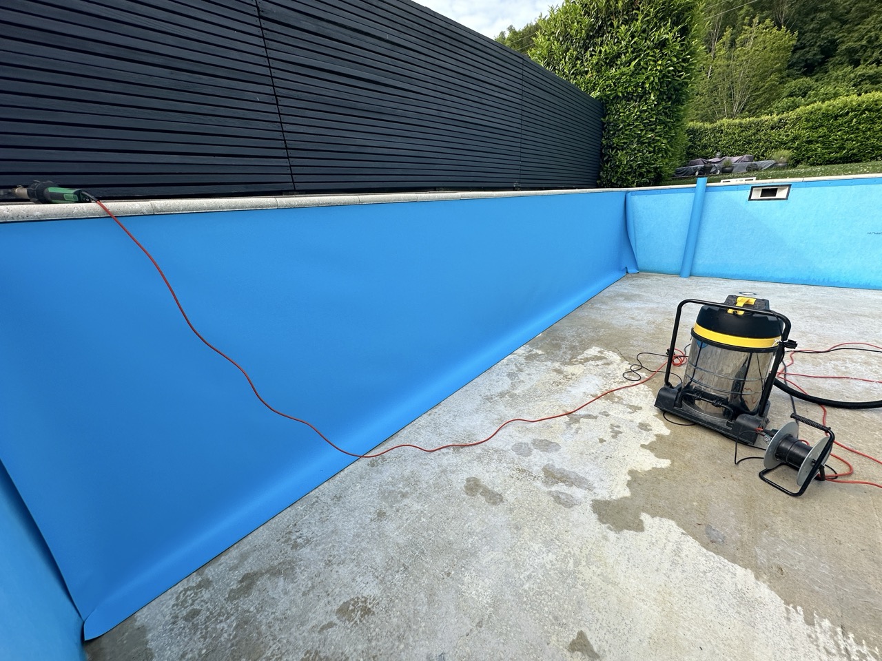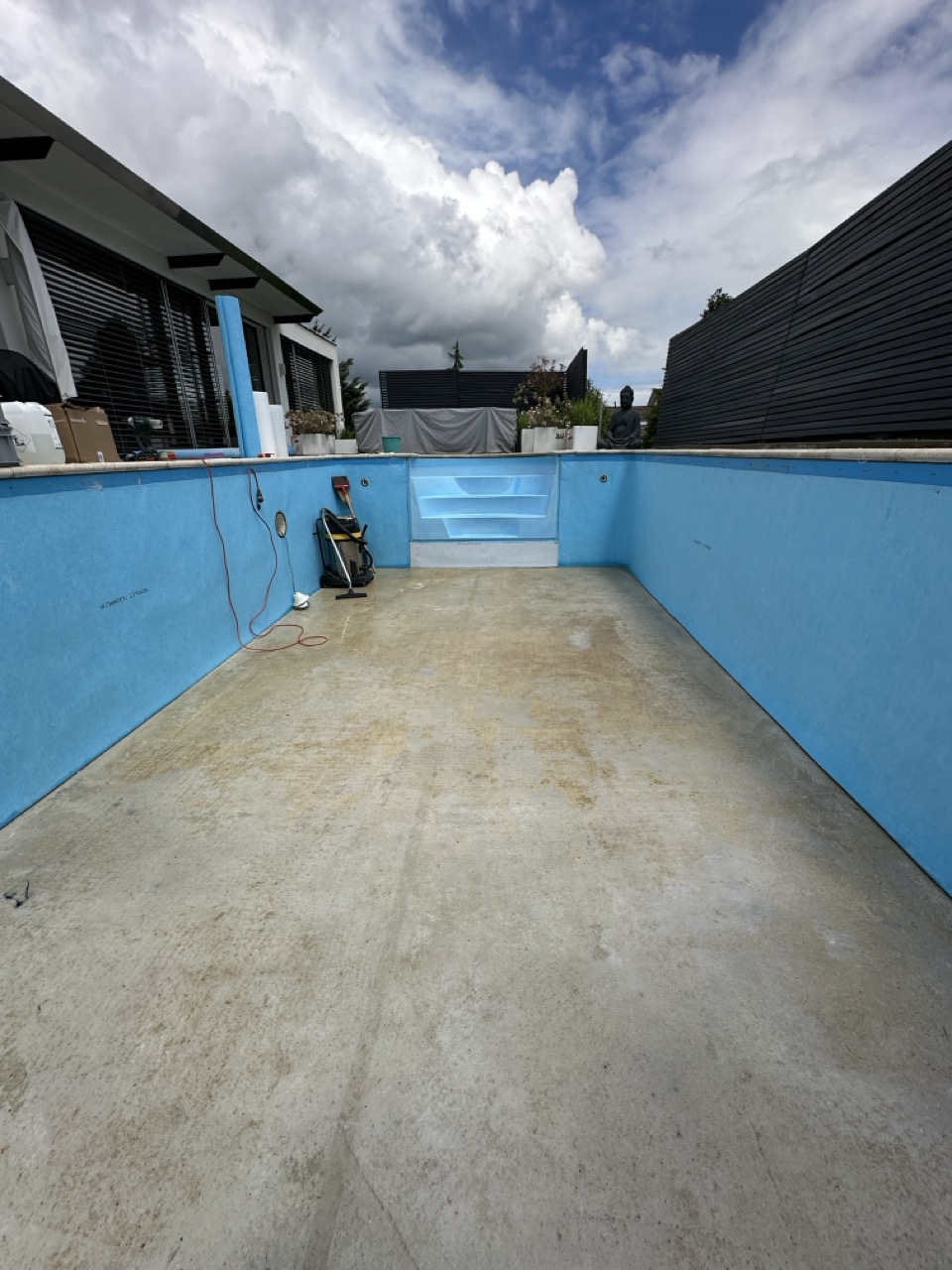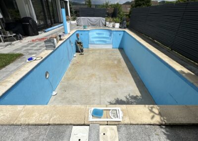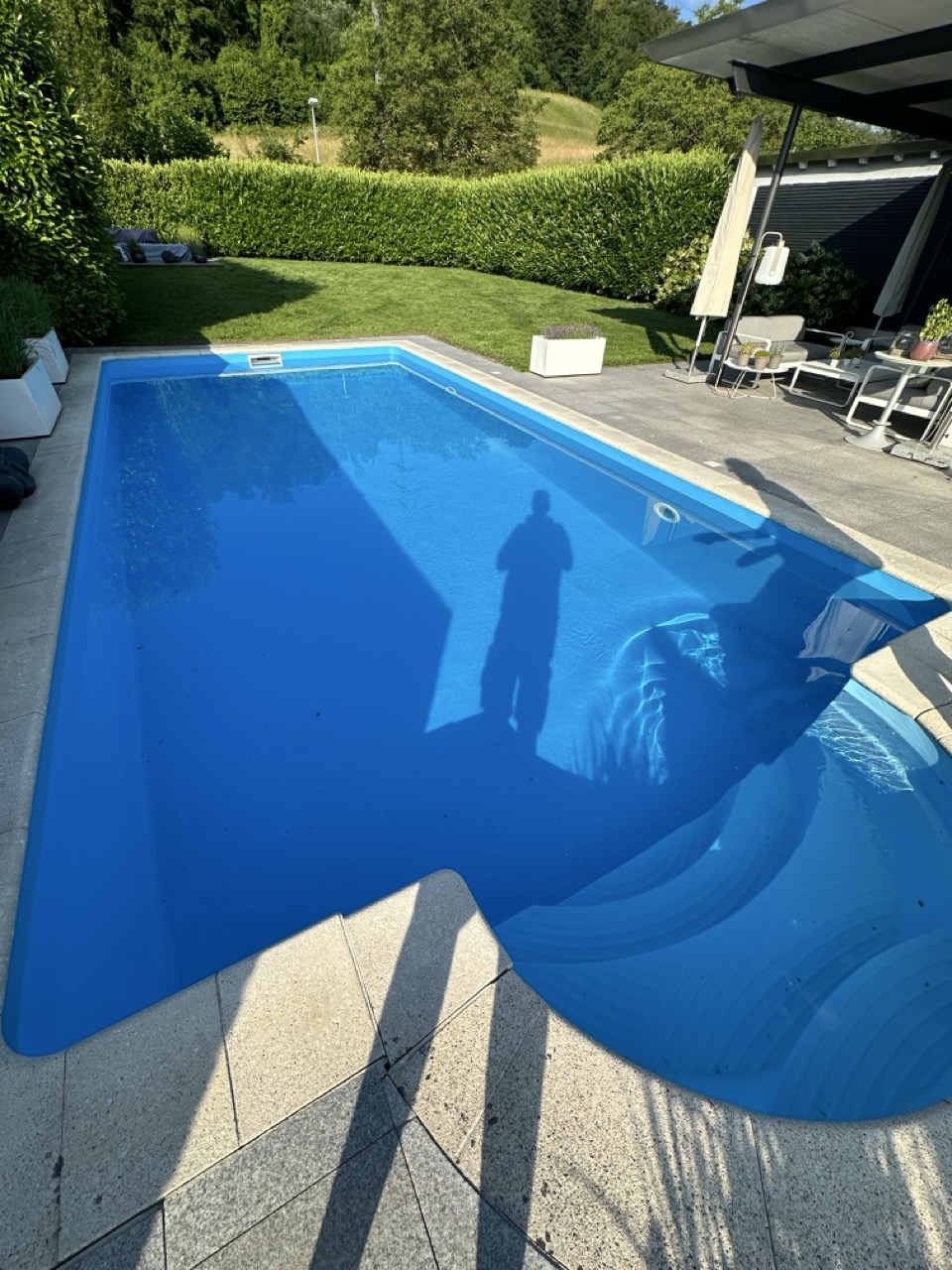 Wir durften für unseren Kunden sein Becken komplett sanieren, das heisst alte Folie und Vlies raus, Wände abschleifen und mit neuem Unterlagsvlies und Folie auskleiden.