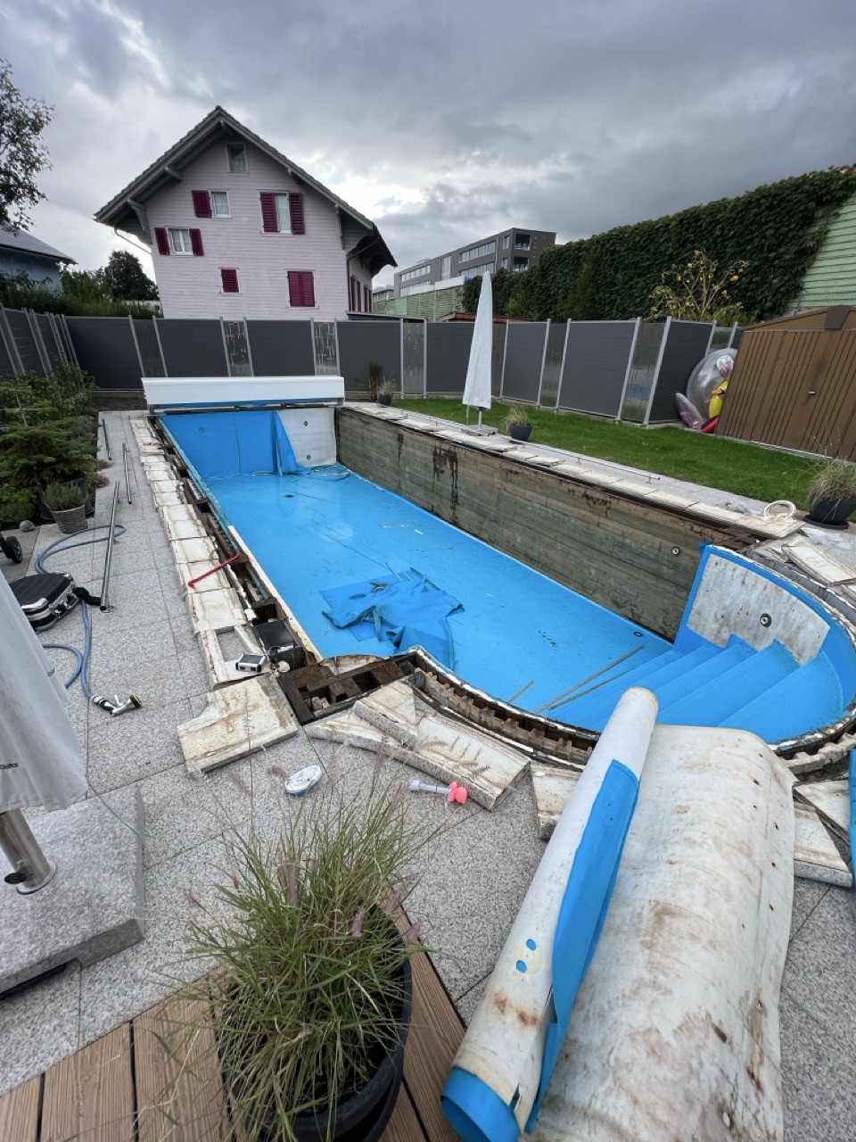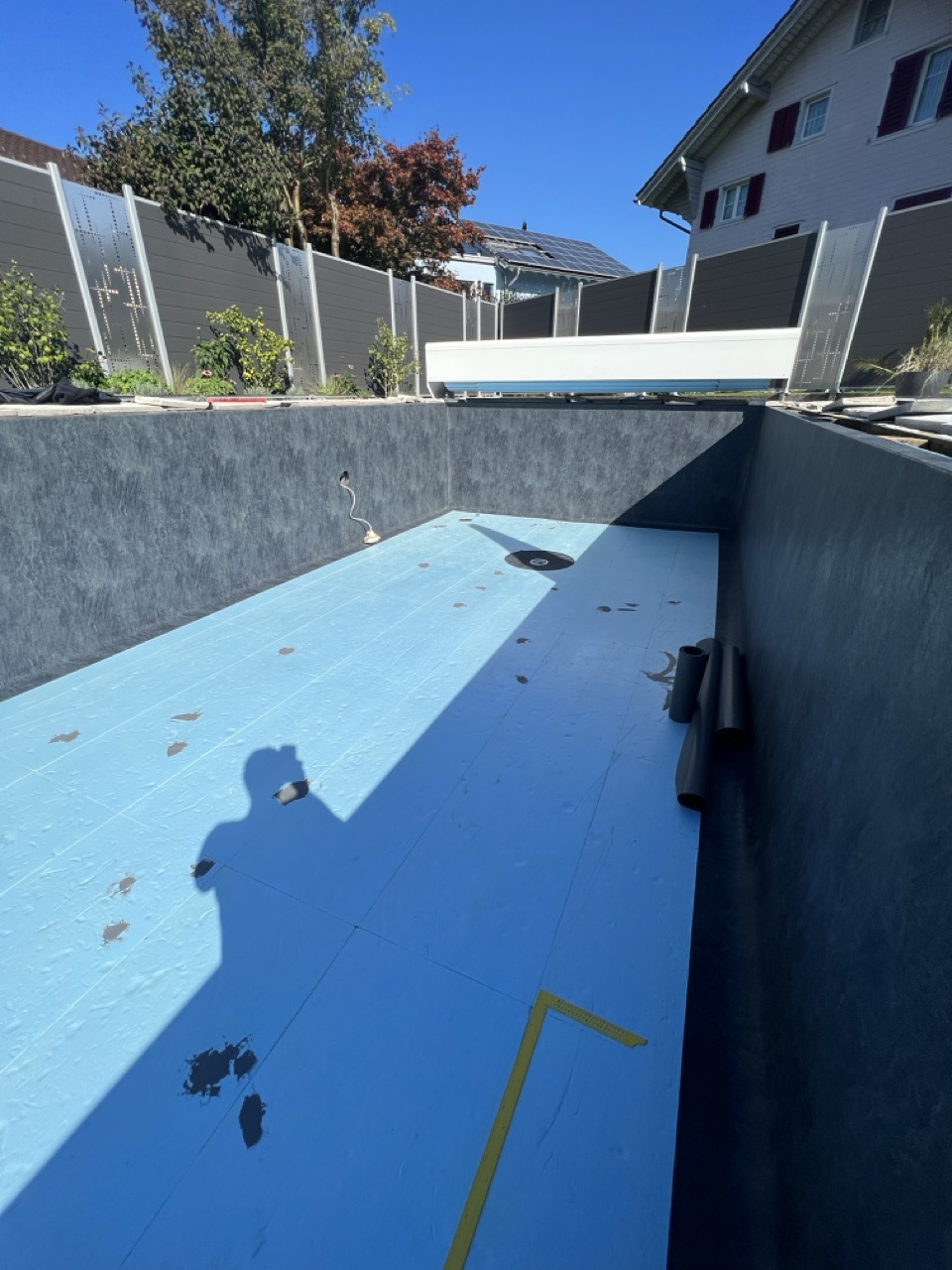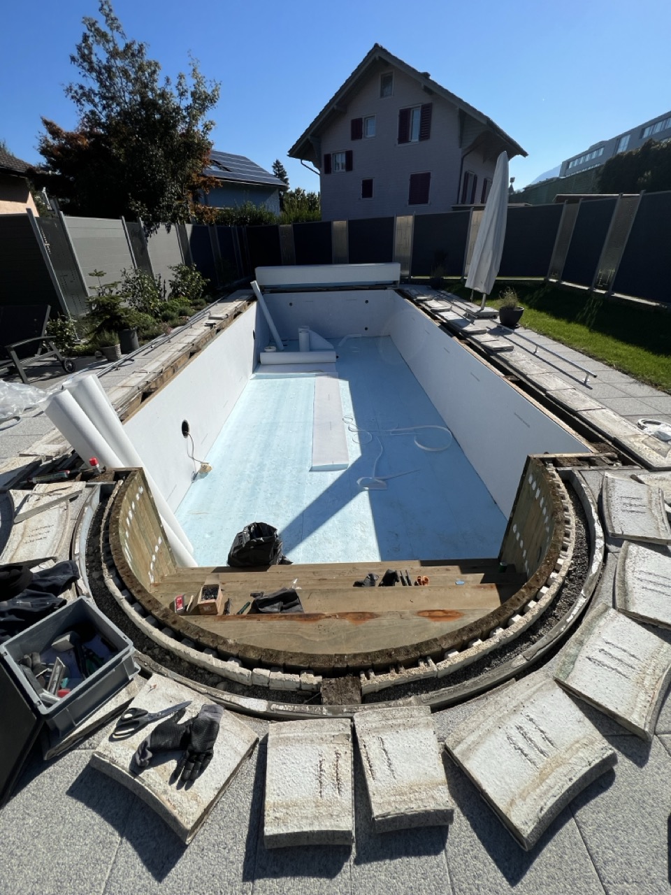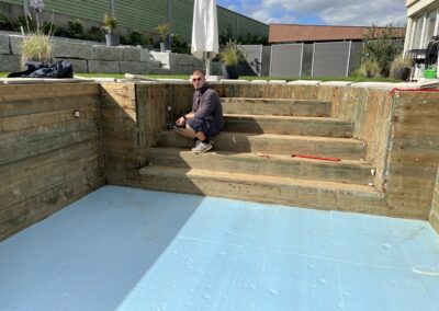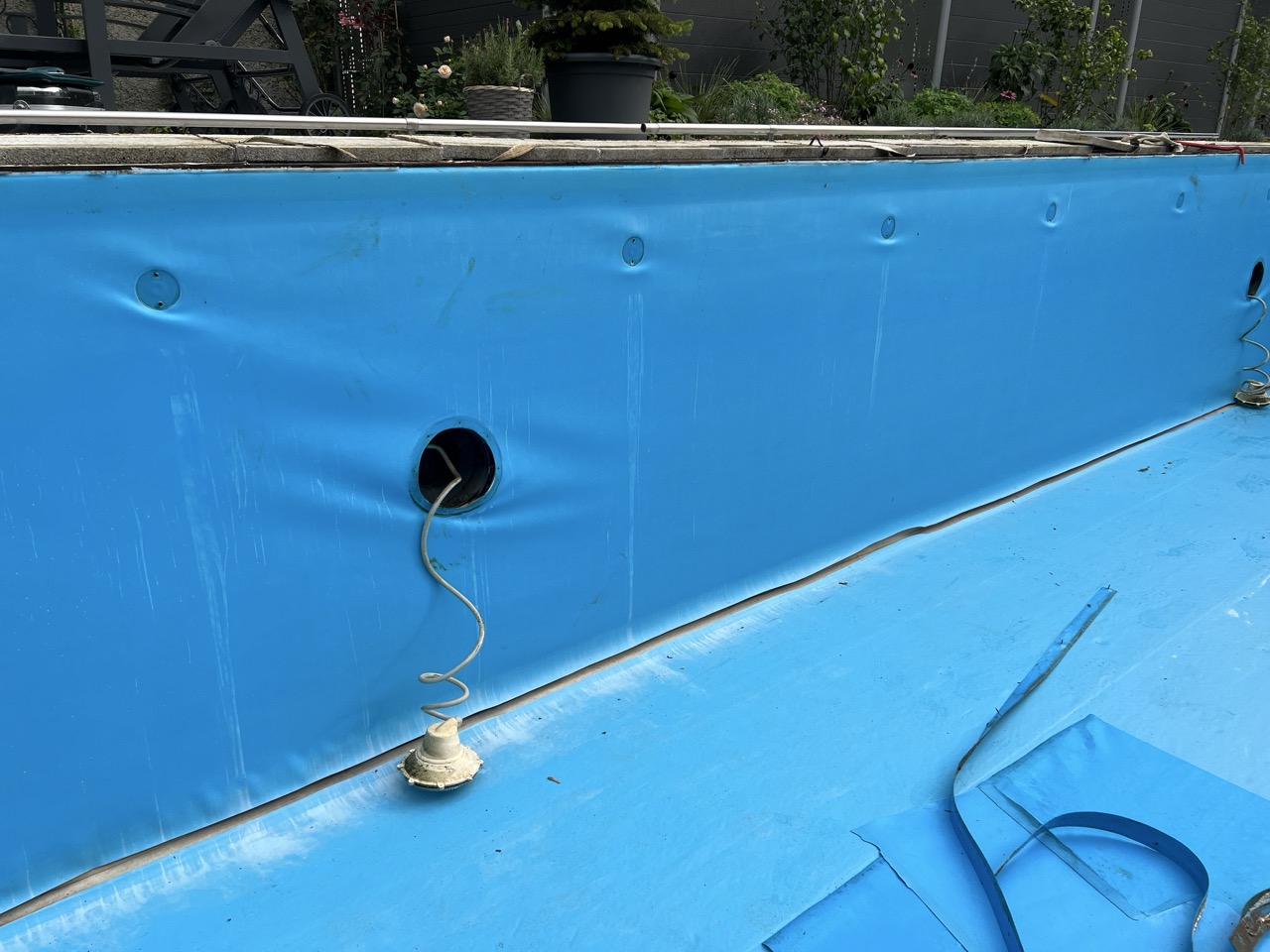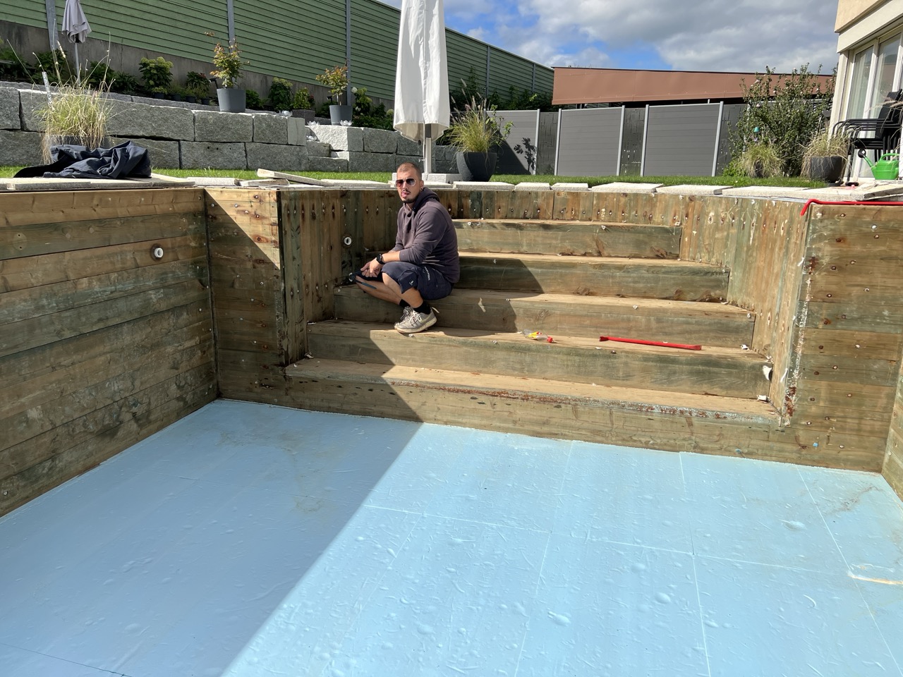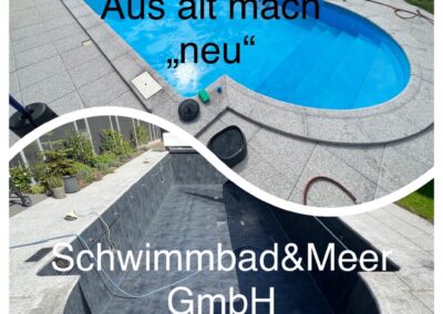 Wir durften für unseren Kunden das alte Holzbecken und die alte Folie mit einer neuen Folie im neuen Glanz erstrahlen lassen. des Weiteren haben wir mit farbigen Unterwasserscheinwerfern und neuen Umgebungsplatten das Becken noch weiter verschönert.
