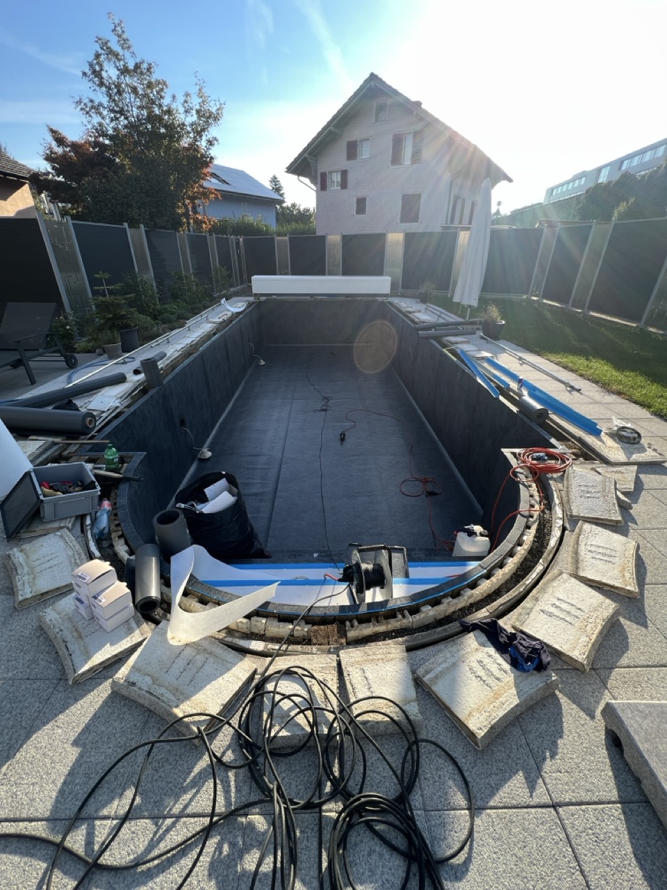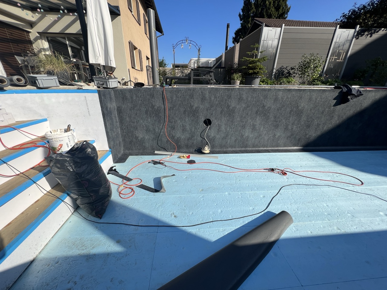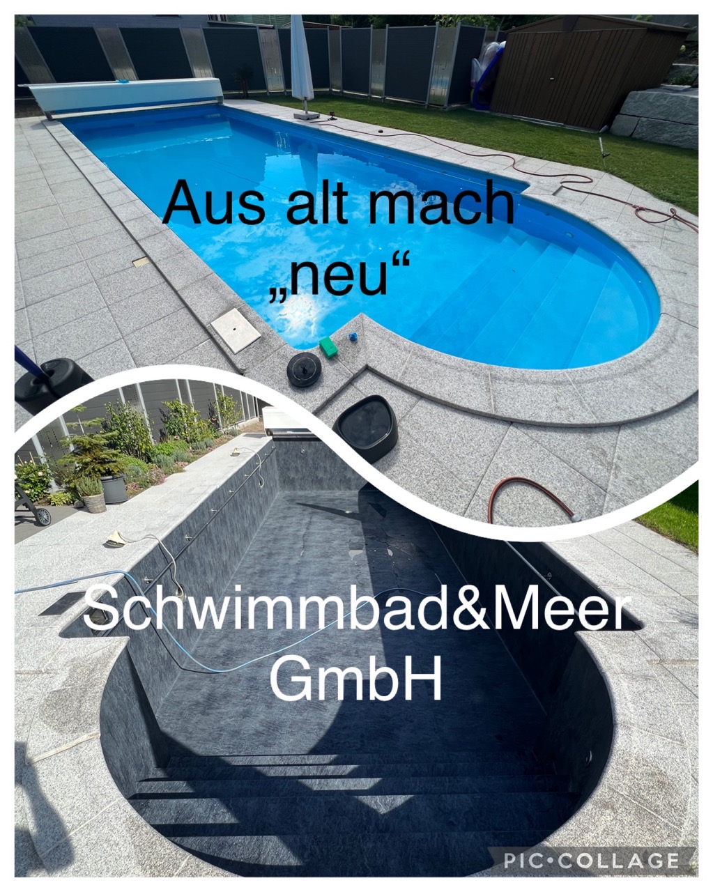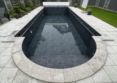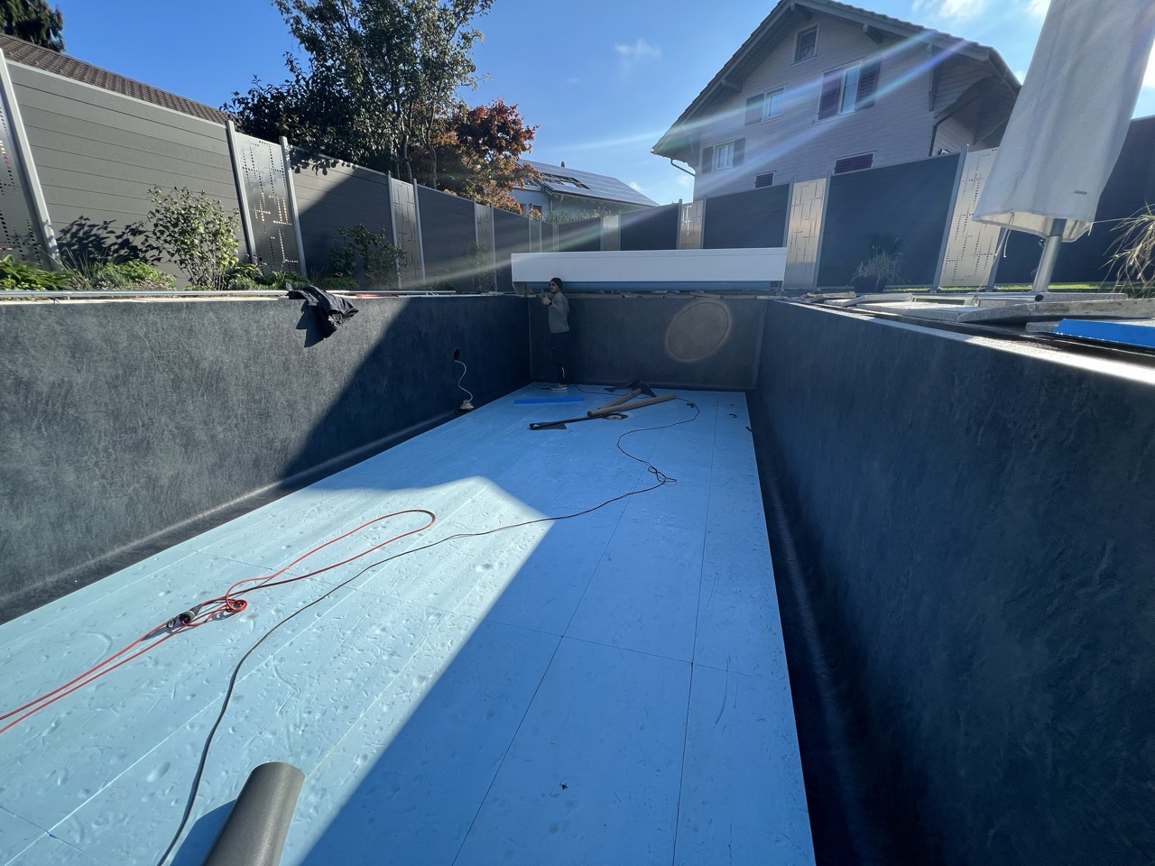 Wir durften für unseren Kunden das alte Holzbecken und die alte Folie mit einer neuen Folie im neuen Glanz erstrahlen lassen. des Weiteren haben wir mit farbigen Unterwasserscheinwerfern und neuen Umgebungsplatten das Becken noch weiter verschönert.