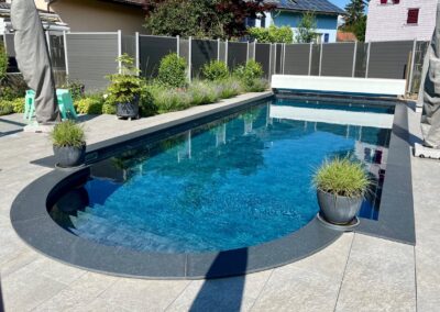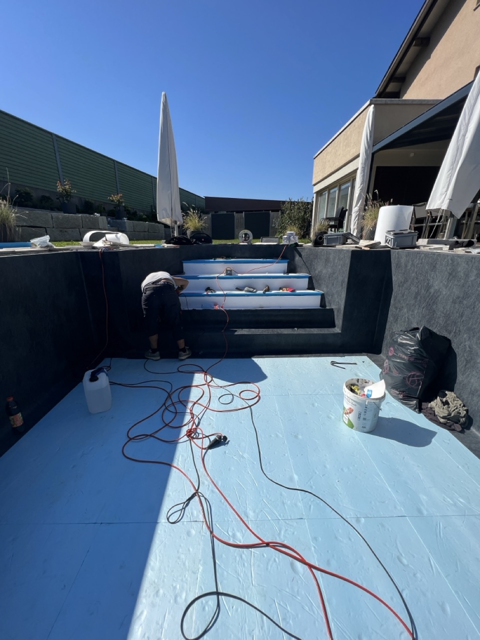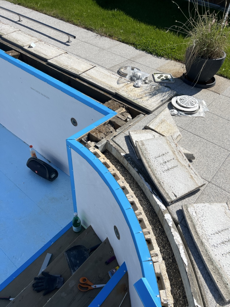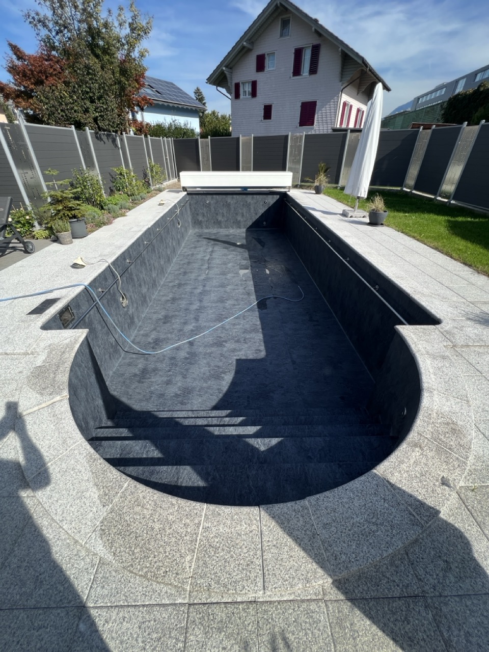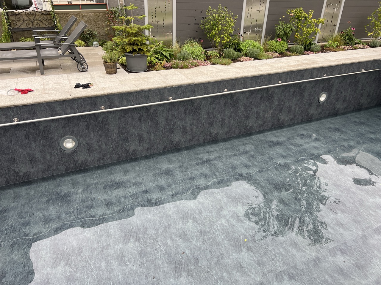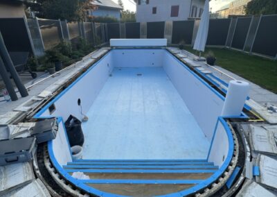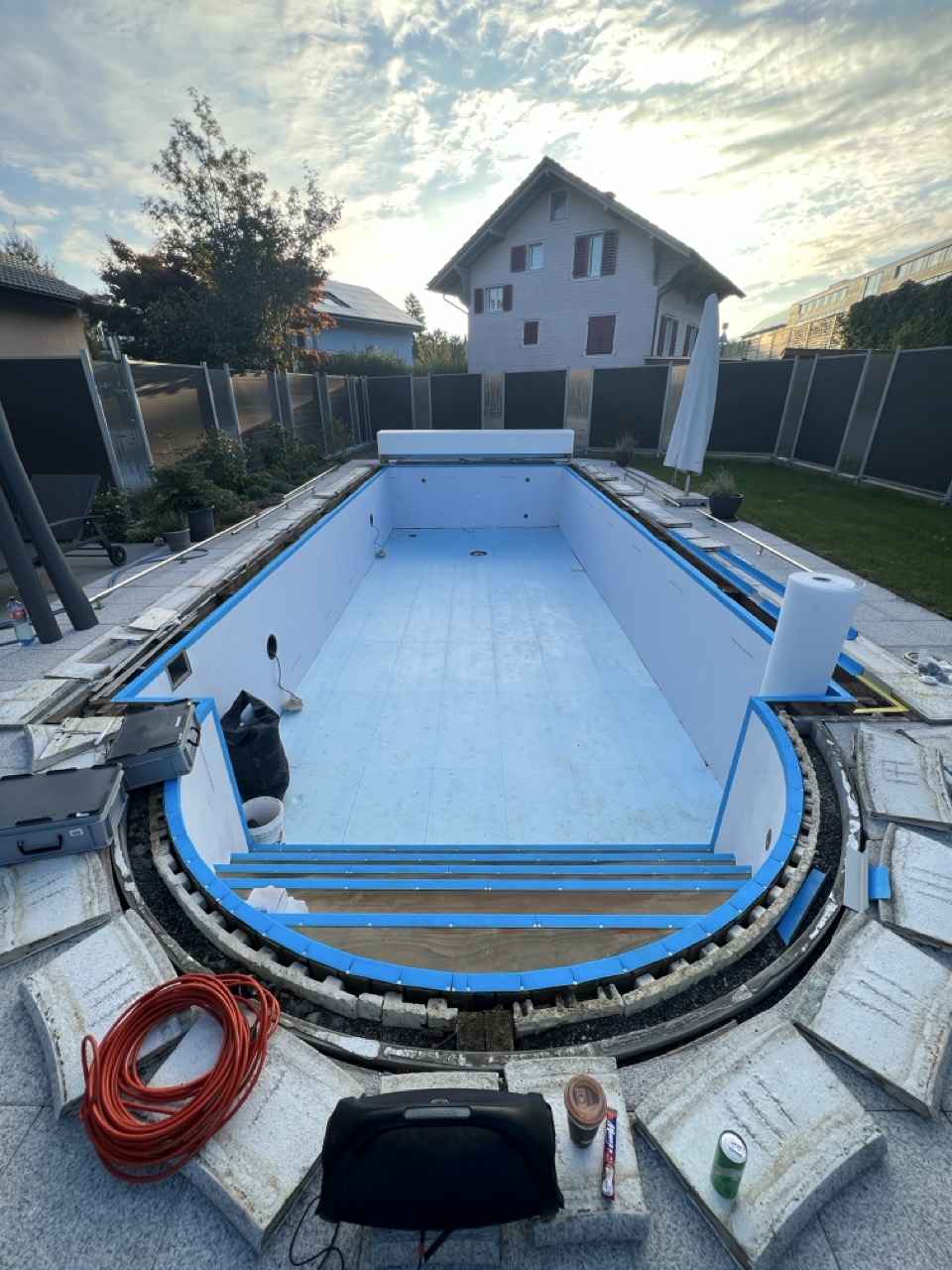 Wir durften für unseren Kunden das alte Holzbecken und die alte Folie mit einer neuen Folie im neuen Glanz erstrahlen lassen. des Weiteren haben wir mit farbigen Unterwasserscheinwerfern und neuen Umgebungsplatten das Becken noch weiter verschönert.
