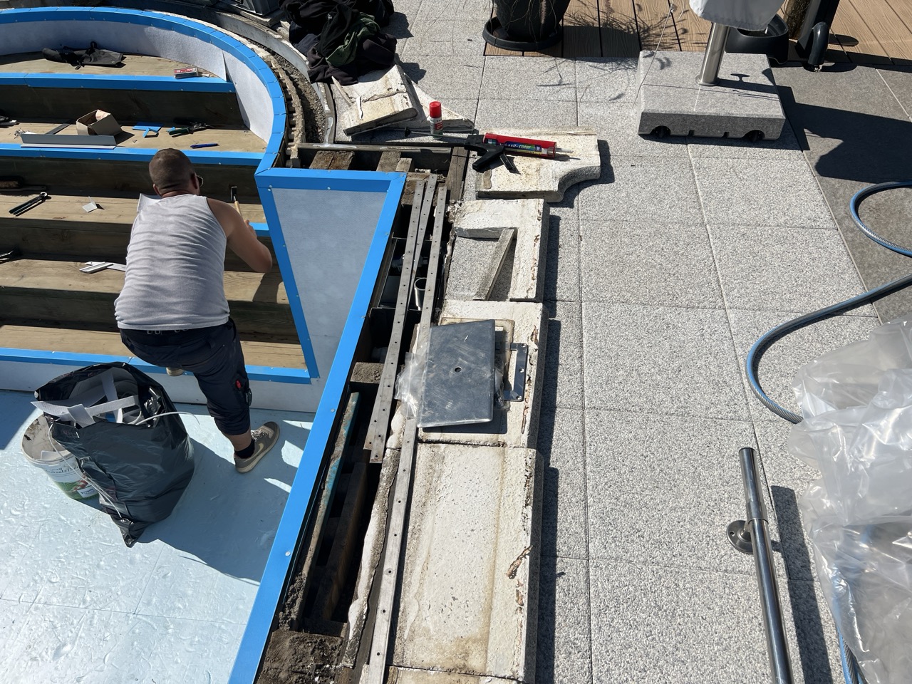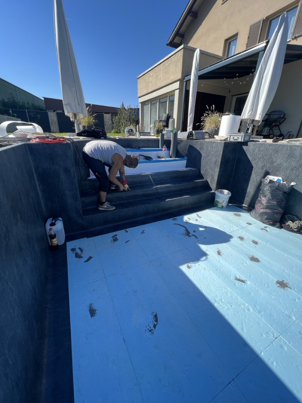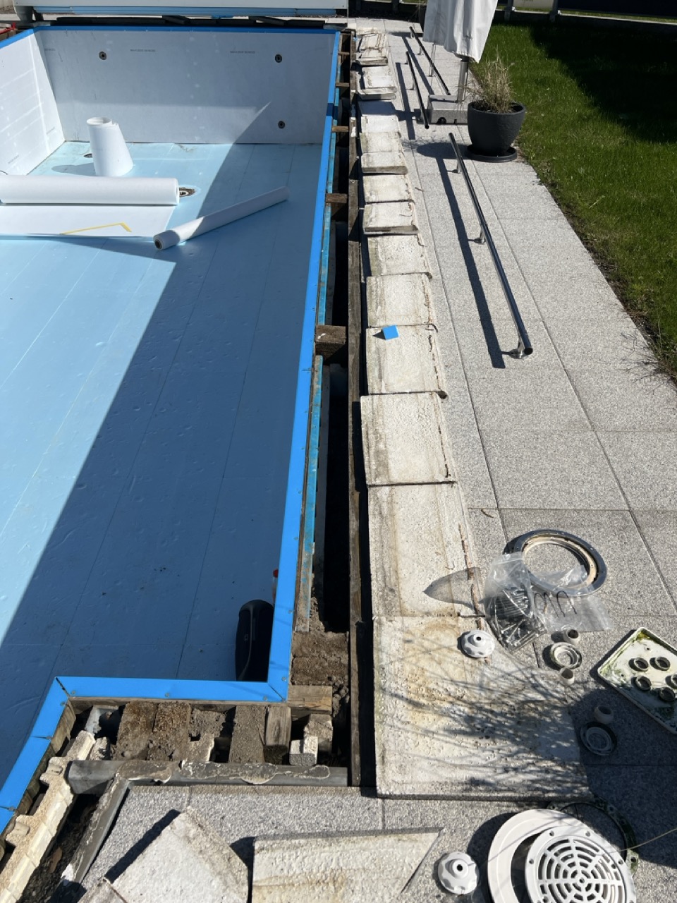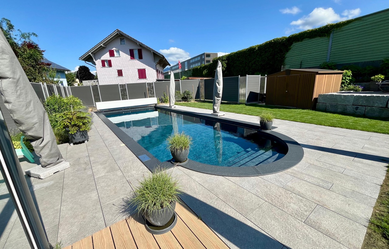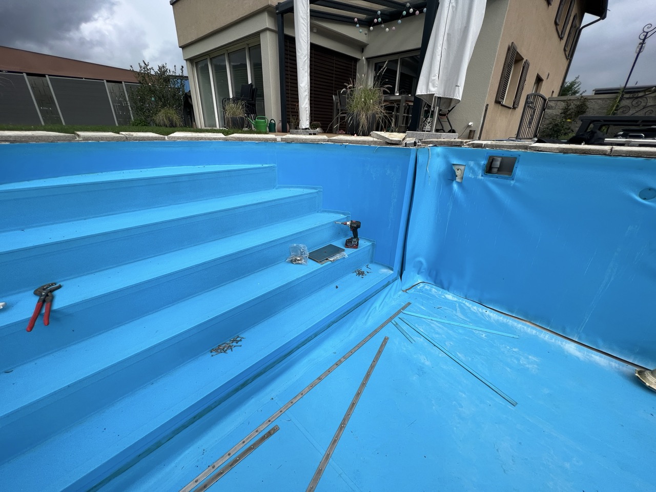 Wir durften für unseren Kunden das alte Holzbecken und die alte Folie mit einer neuen Folie im neuen Glanz erstrahlen lassen. des Weiteren haben wir mit farbigen Unterwasserscheinwerfern und neuen Umgebungsplatten das Becken noch weiter verschönert.